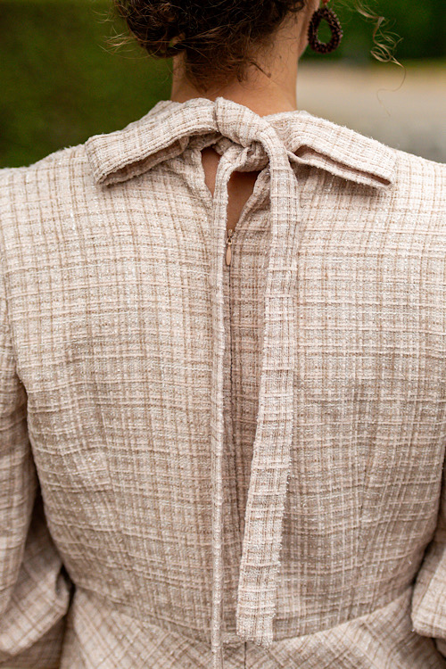 Soepelvallende boucle stof. Mooi strik detail op de rug.